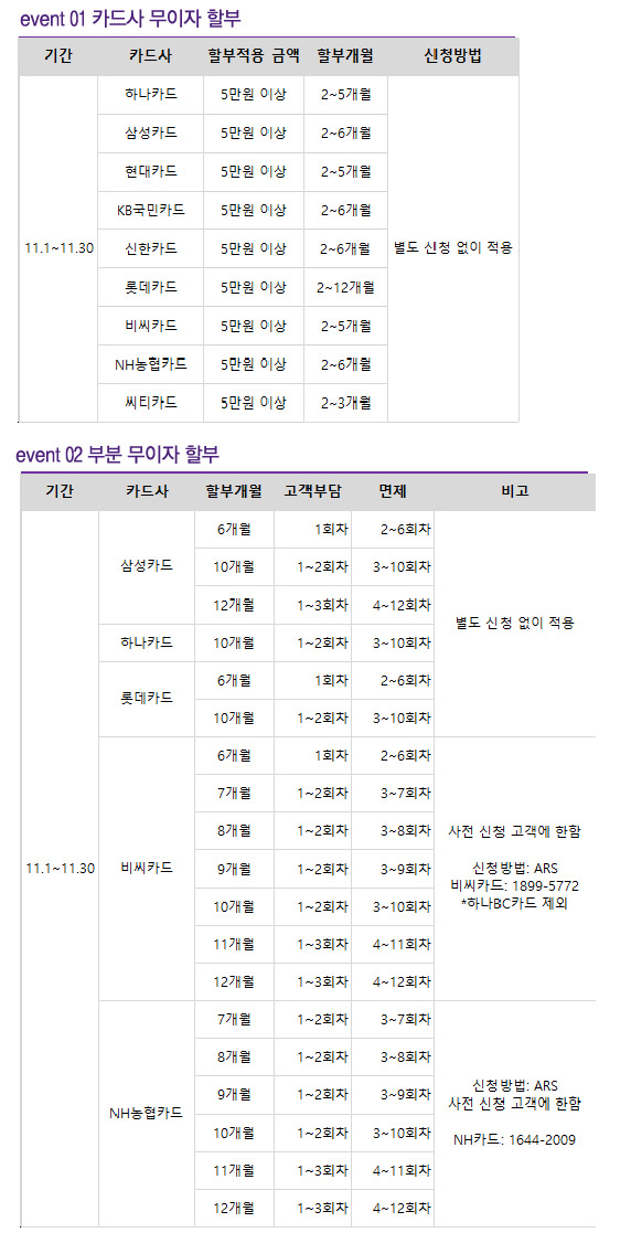 notice 2017년 11월 카드사 무이자 할부 이벤트 안내