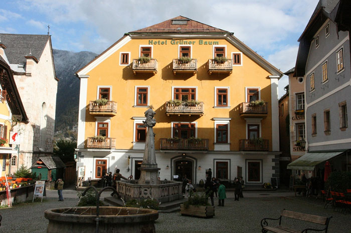 다흐슈타인 산과 한 폭의 그림같은 호수에 둘러싸인 할슈타트. 그리고 할슈타트 마을의 중심에 위치한 그루너바움 호텔은 호수를 바라보며 바로 뒷편으로는 광장이 보인다.