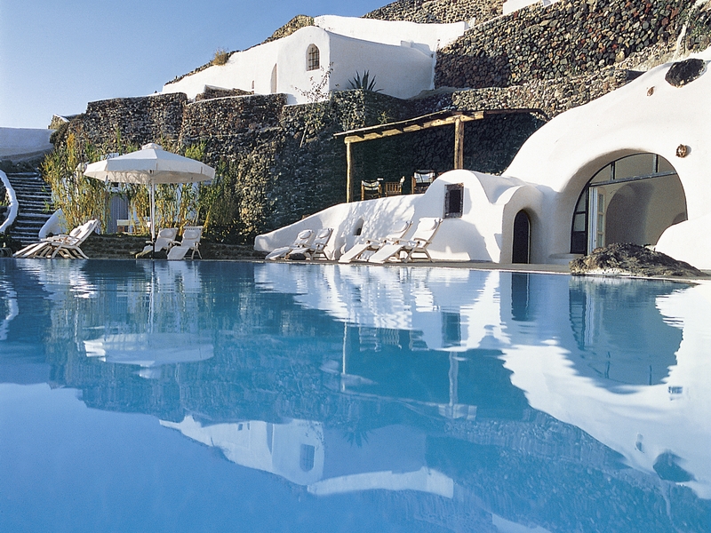 산토리니 섬의 불규칙한 지형에 순응하여 직선과 평면이 아닌 부드러운 곡선의 형태로 되어있는 호텔의 건축은 객실 내부에까지 그대로 적용되어 있습니다. 벽과 바닥, 가구들까지 모두 깨끗한 하얀색을 바탕으로 되어 있으며 곳곳에 배치된 강렬한 색의 액센트는 페리볼라스 호텔의 인테리어를 완성시키고 있습니다.