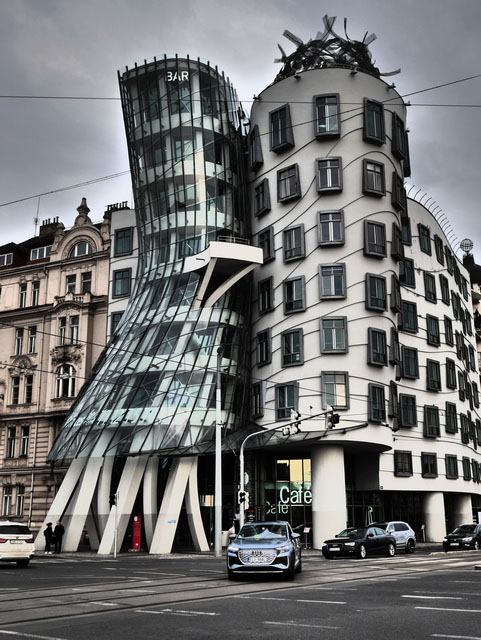 고건축물 사이에서 조화를 이루며 서있는 "춤추는 빌딩"