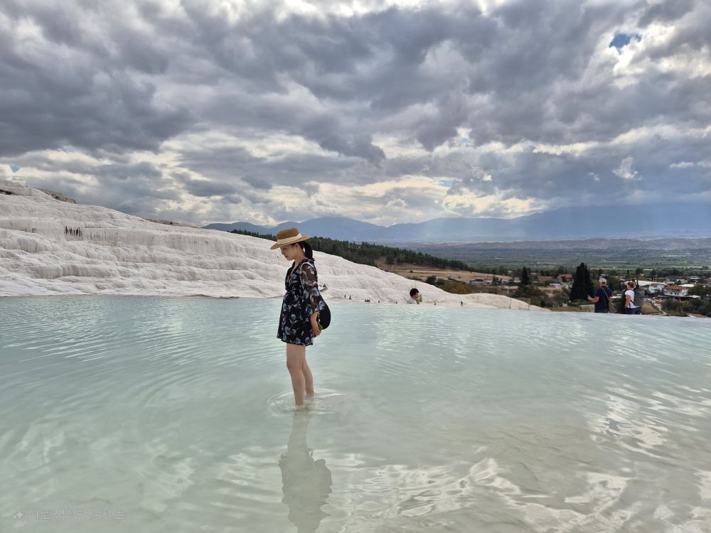 2. 괴뢰메에서 야간버스(10시간소요)를 타고  목화성 파묵칼레에 도착했습니다(1박2일 일정). 아침에 도착한터라 피곤했지만 유네스코세계유산을 언제보겠나 싶어 파묵칼레를 향했습니다. 다행이 블루여행사에서 잡아준 호텔이 파묵칼레 마을입구에서 가까운 곳이라 도보로 금방도착했습니다. 입장료가 비쌌지만(튀르키예 왠만한 유적지등 입장료가 2인 기준 대략10만원) 히에라폴리스, 극장 등 포함된비용으로 눈도장 많이 찍고 왔어요.