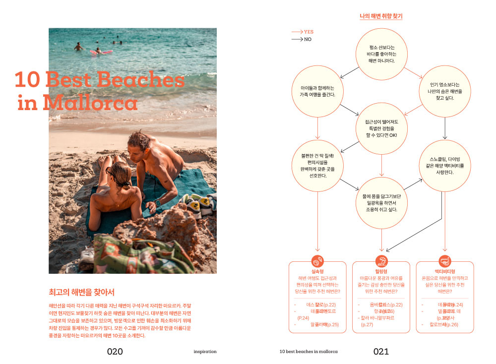 낯설지만 매력적인 마요르카와 첫인사를 나누는 시간. 마요르카 여행에서 빼놓을 수 없는 핵심 포인트인 최고의 해변, 다채로운 액티비티, 쇼핑정보, 미식 정보가 담겨져 있습니다. 여행 스타일에 맞는 추천 여행법을 통해 나만의 마요르카 여행을 꿈꿔봅니다.